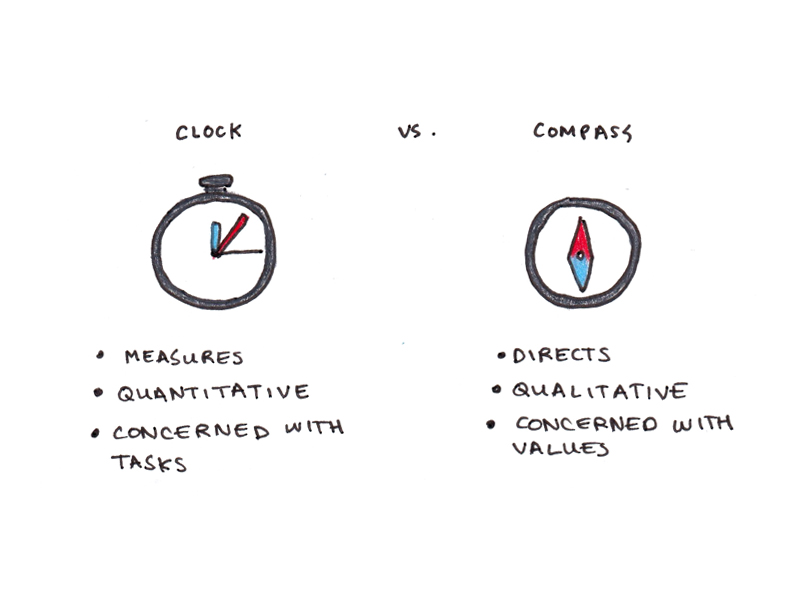 One metaphor Covey relies on is contrasting a clock with a compass. A clock turns time into a measurable quantity that you can slice up, allocate and plan with—something you can manage. In contrast, a compass doesn’t give you a plan; all it can do is show you whether or not you’re headed in the right direction.