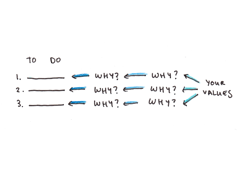 What this questioning does is identify the things you’re being motivated to do by more superficial reasons and those that truly resonate with you (e.g., “I want a six-pack so people will think I’m hot.” versus “I want to be healthy so I can continue to live well into old age.”). Even more, it also helps you recognize the things that truly matter to you that aren’t “productive” and so don’t normally fit into a task-oriented to-do list, such as building relationships, deep thinking and kindness.