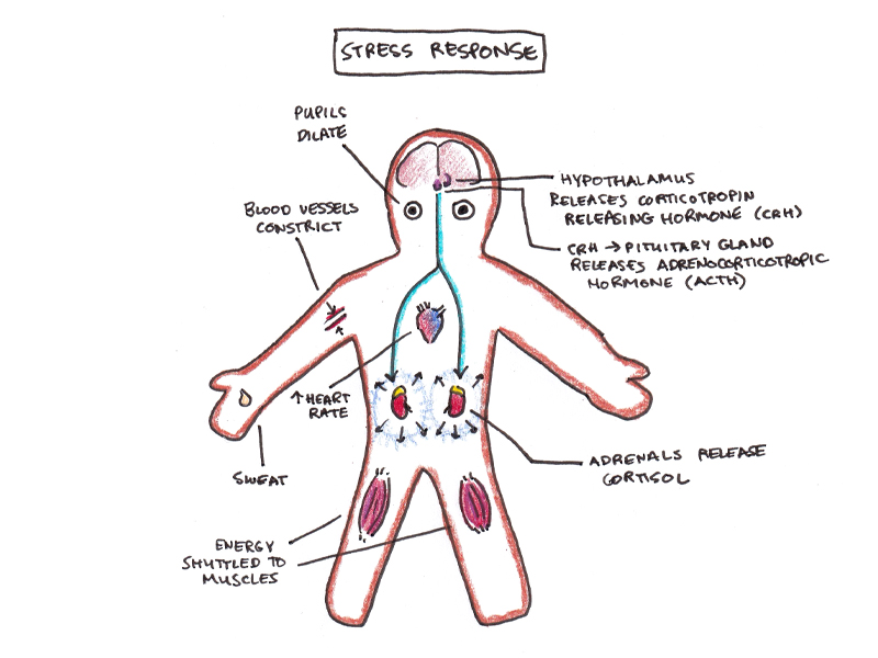 Stress begins when the brain senses a threat. That could be external (e.g., a lion is chasing you), it could be internal (e.g., you’re losing a lot of blood) or it could even be purely psychological (e.g., you have an exam in two weeks that you haven’t studied for). This causes a cascade of hormones to be released that mobilize your body into action. Energy is diverted away from long-term processes like growth and repair, and poured into muscles to enable you to quickly move away from that threat. Your immune system is diverted to the front lines to deal with immediate infections at the site of injury (spending less on the antibodies that might tackle longer-term illnesses like colds, flus or cancers). Your attention narrows and your memory is temporarily enhanced.