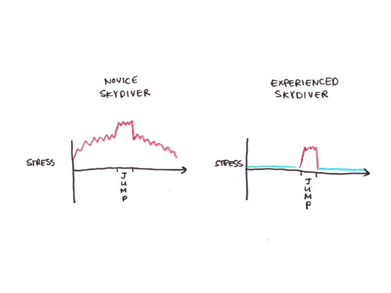 If you think about it, this is exactly what you’d want. A racing heart and sweaty palms for hours before or after your jump aren’t helpful. But the boost in alertness and energy that accompanies the stress response is probably beneficial when you need to remember to pull your ripcord as you’re hurtling towards the ground in free fall.